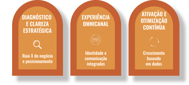 Mais do que um plano, é uma execução organizada, com entregas práticas e mensuráveis. A metodologia está dividida em 3 pilares que sustentam marcas prontas para crescer com clareza, conexão e autoridade.